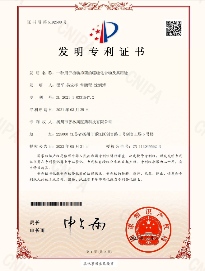 近期,qy球友会下属企业扬州市普林斯医药科技有限公司申报的“一种具有抑菌性能的噻唑化合物及其用途”、“一种噻唑化合物及其用途”、“一种用于植物抑菌的噻唑化合物及其用途”、“一种抑制肿瘤细胞生长的噻唑化合物及其用途”4项发明专利,取得国家知识产权局授权并取得专利证书。